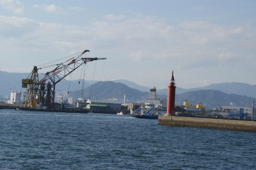 クレーン船と赤灯台