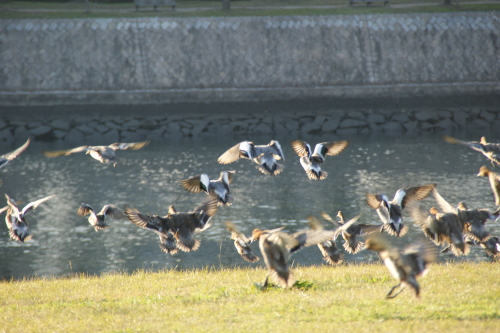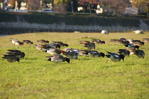 橋の反対側の土手で野鳥の群れが土手の虫をついばんでいます