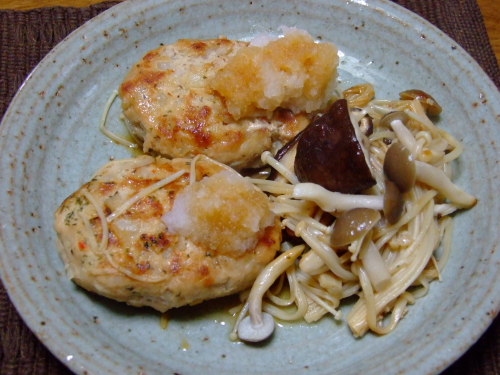 寒い日は温かくして過ごしましょう 風邪気味なのでswimming はあきらめて どんぐり村のレンコンで鶏肉ハンバーグを作ってみました 大根おろしにポン酢をかけて食べます