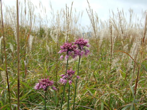 ススキに混じって ヤマラッキョウがかわいい